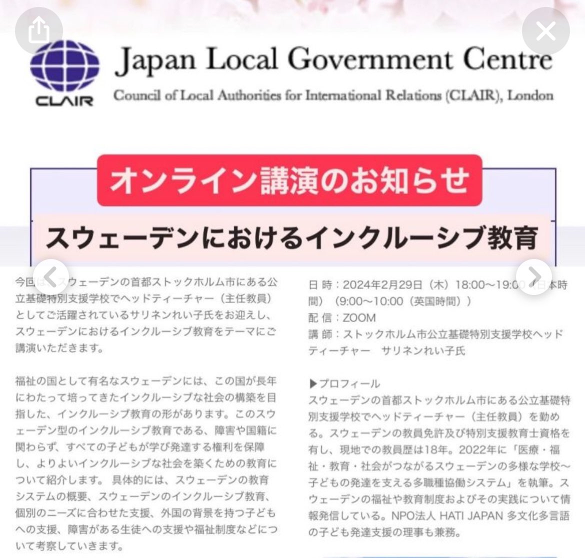 スウェーデンにおけるインクルーシブ教育という講座です。