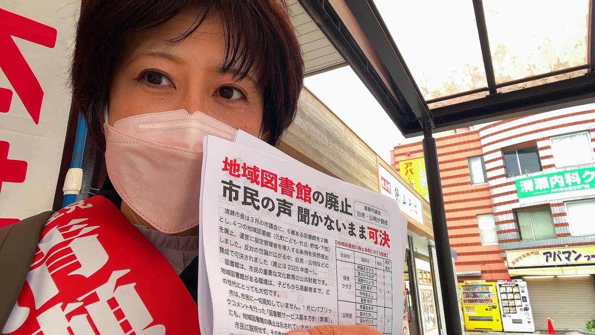 朝の清瀬駅南口の宣伝、共同親権なんて乱暴なことを進めてもう冗談じゃない!!と訴えているところです。顔が怒ってる💦4つの地域図書館の廃止条例の反対についても、今後も取り組み続ける決意を。今日も反対のチラシを配りました。「知らなかった」と声をかけてくださった方も…まだまだ広がって欲し…