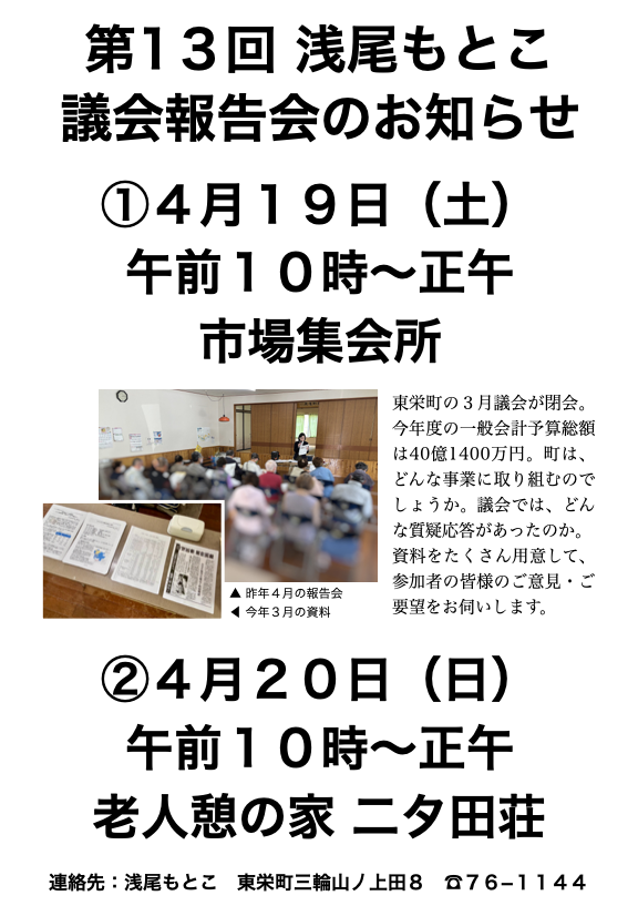 日本共産党の浅尾もとこ町議の議会報告のお知らせです。