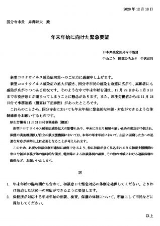 本日(12月18日)、「年末年始に向けた緊急要望」を国分寺市に提出しました。