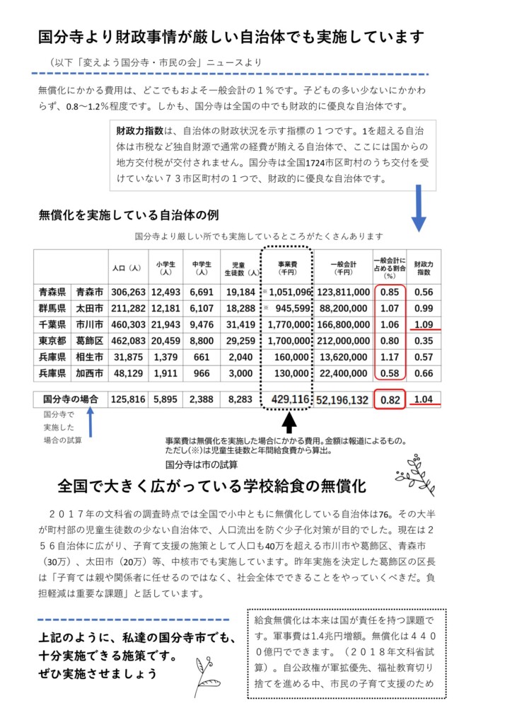 しかし、全国的には無償化する自治体が増えています。2017年には76自治体だったのが256次知多へと3倍以上に。さらに増え続けています。都内では23区中13区で無償化あるいはその方向性が表明されています。多摩地域では青梅市と清瀬市が2023年3月まで無償化し、狛江市が4月以降第3子を無償化する予算を計上しているそうです。狛江市のような段階的な無償化も求めましたが、全く検討さえしようとしません。