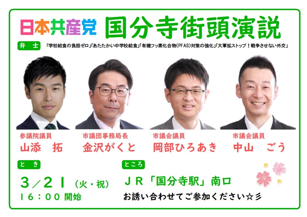 3月21日(火)、午後4時から国分寺駅南口で、山添さんを呼んでの街頭宣伝です