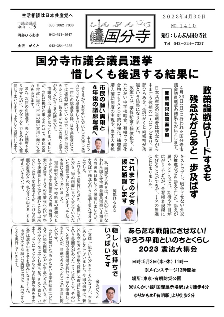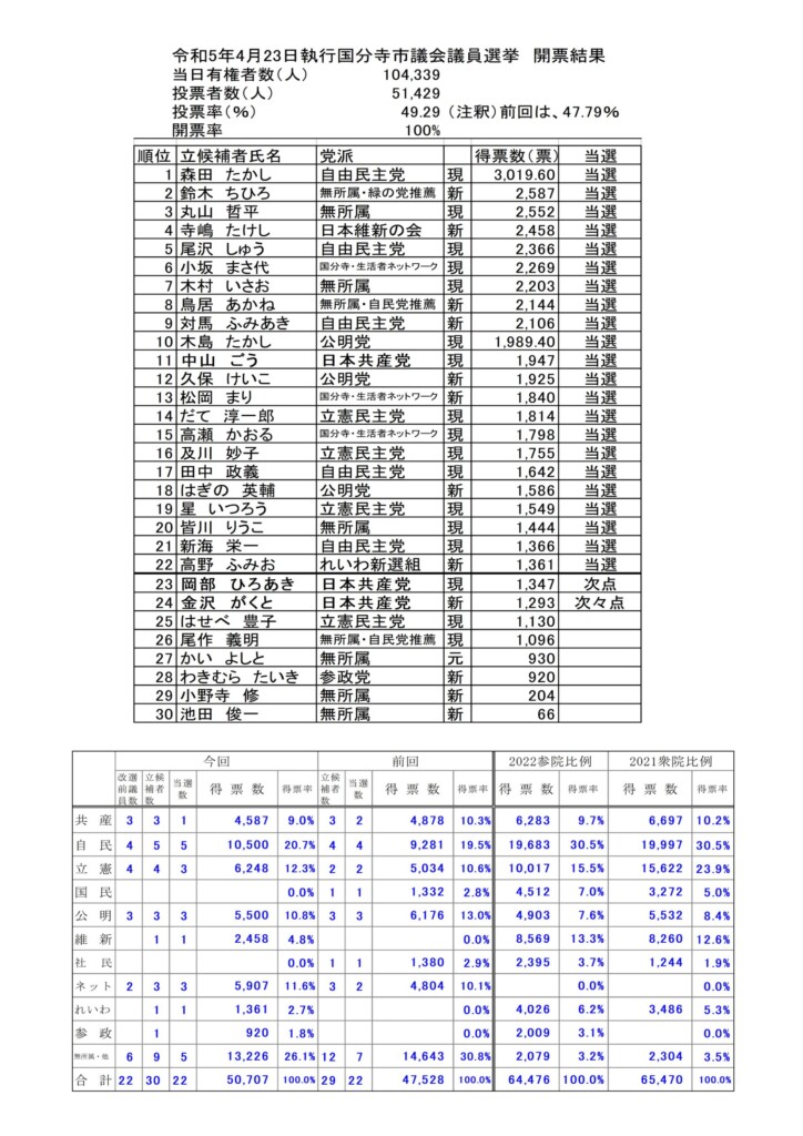 国分寺市議会議員選挙の結果について