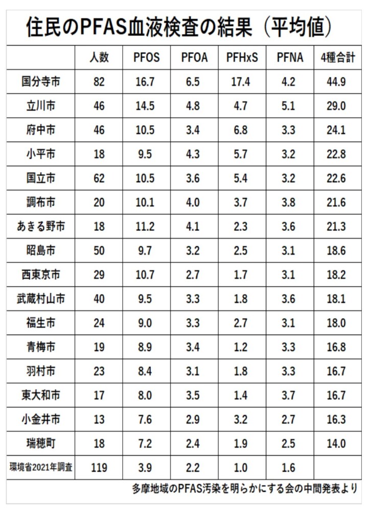 市民団体が多摩地域の住民を対象に行った血液検査で、国分寺市民のPFAS血中濃度が他市の住民と比べて高いことが明らかになりました(表参照)。この表は中間発表から作成しましたが、本日(6月8日)に検査結果まとめの記者会見が午後1時から行われます。