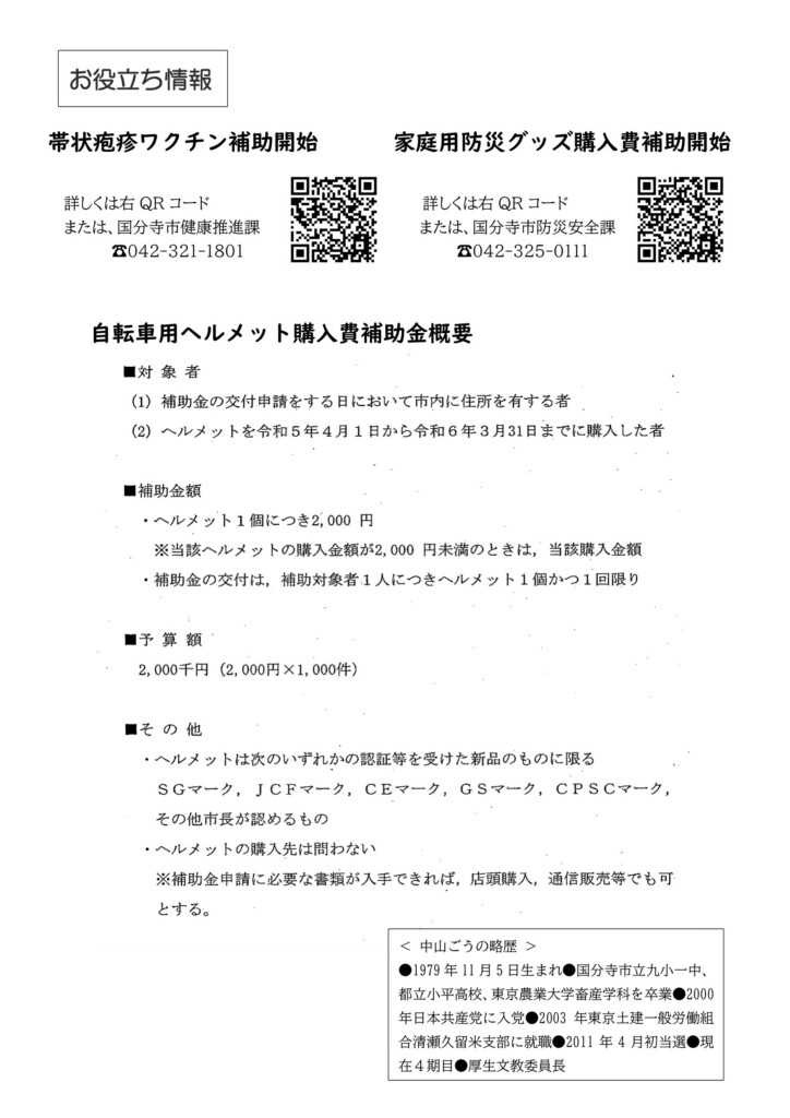 国分寺市の帯状疱疹ワクチン補助や自転車ヘルメット購入補助など