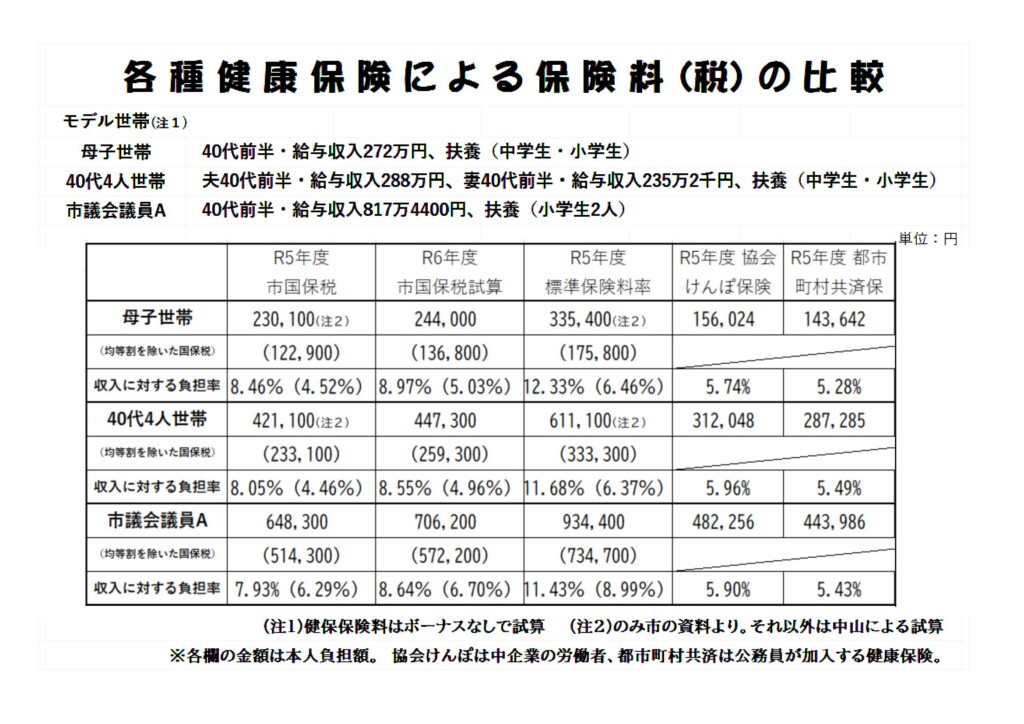 同一世帯、同一収入での国民健康保険税と協会けんぽや公務員共済の保険料を試算しました。国保税の負担の重さに驚きます!せめて、国保税の均等割の廃止が必要です。