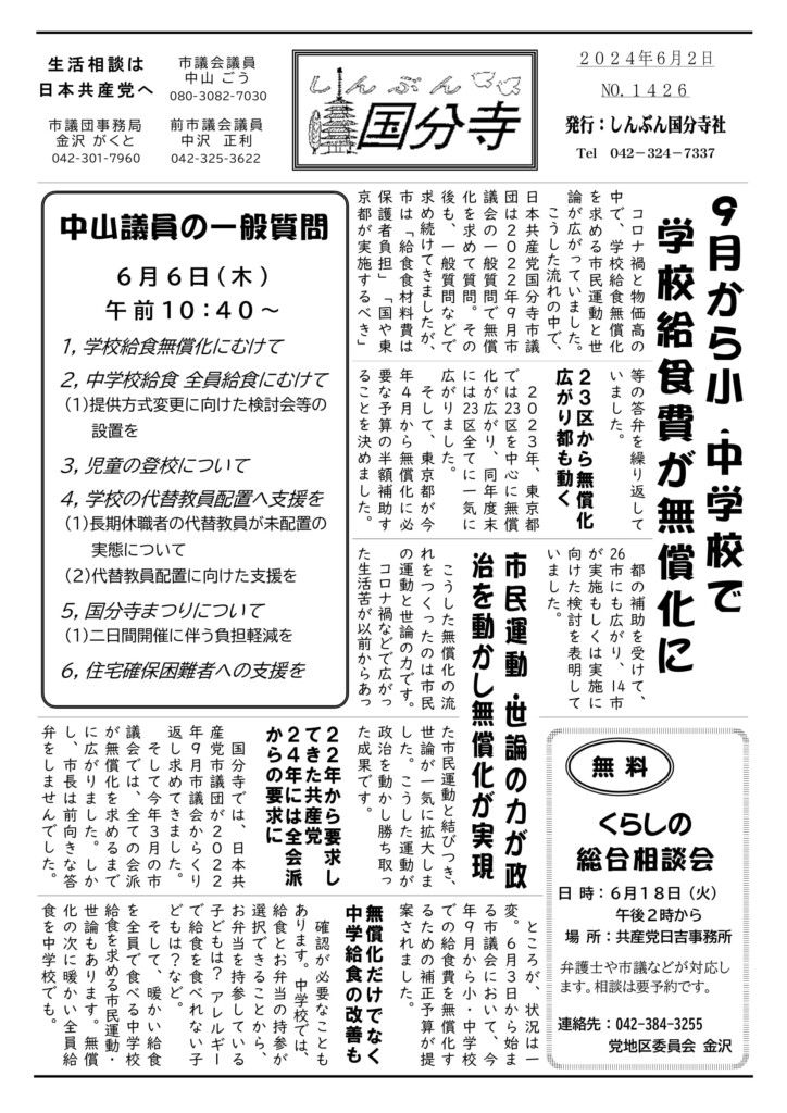 国分寺でも学校給食無償化へ しんぶん国分寺