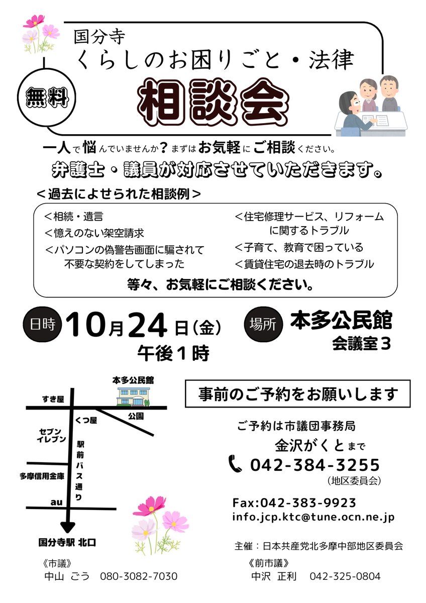 無料 生活相談会 弁護士や議員が対応しています。 どなたでも参加できますので、 お気軽にお越しください。(予約制ですので事前にご連絡をお願いいたします)