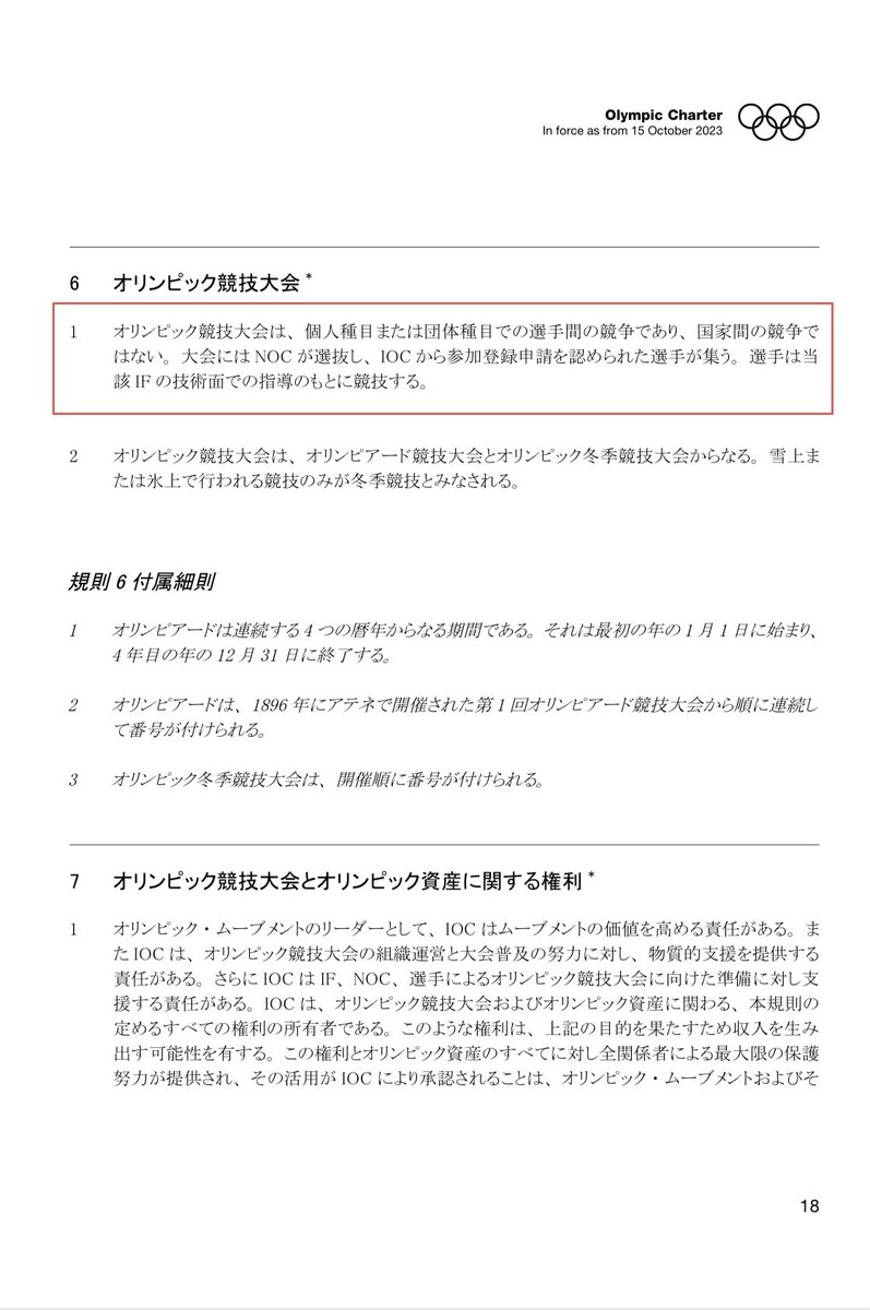 オリンピック競技大会は、個人種目もしくは団体種目での競技者間の競争であり、国家間の競争ではない