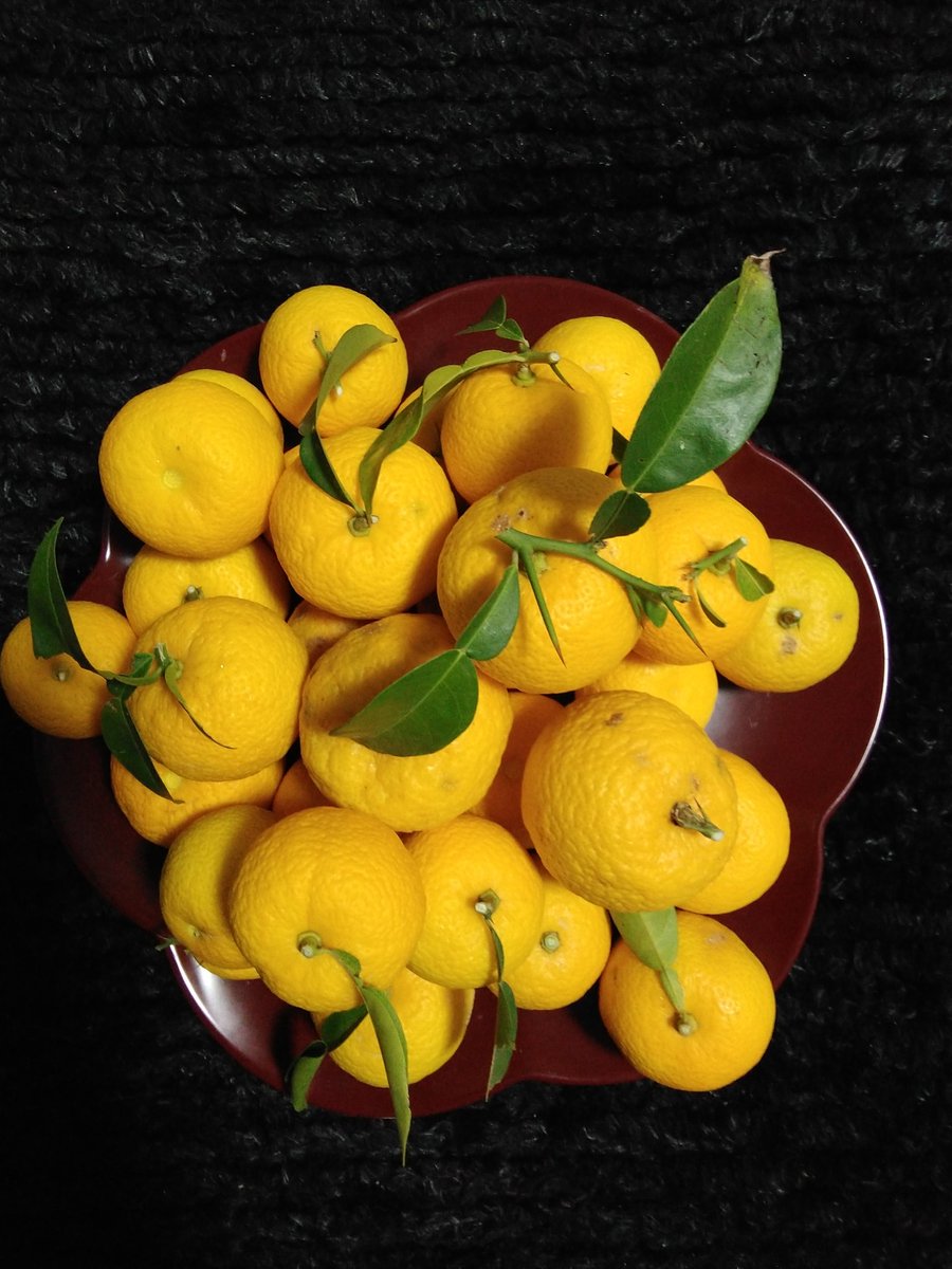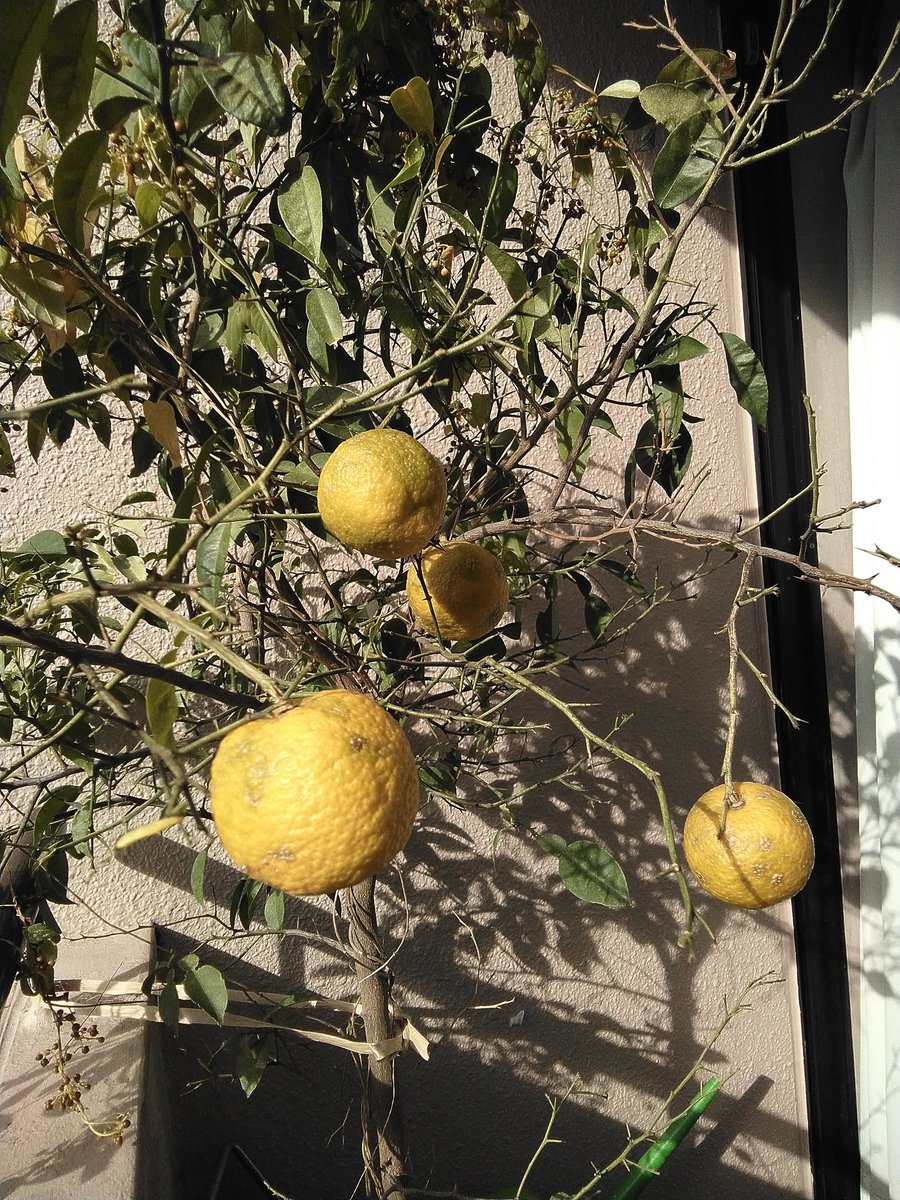 初めての収穫、嬉しい!ベランダで種から育てた2本の柚子の木に、32個も小さい柚子が実りました。