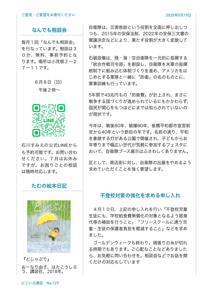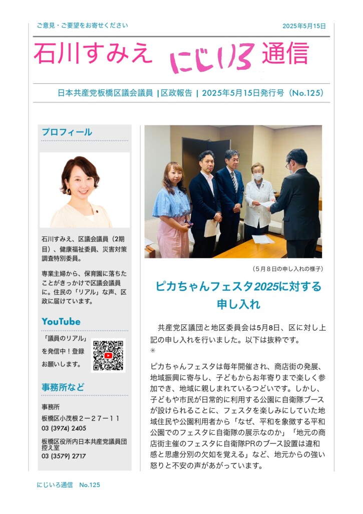 今年は、戦後80年、被爆80年、板橋平和都市宣言制定から40年という節目の年です。名前の通り、平和を象徴する灯がある公園で開催され、子どもからお年寄りまで幅広い世代が気軽に参加するフェスタにおいて、自衛隊ブース展示はふさわしくありません。