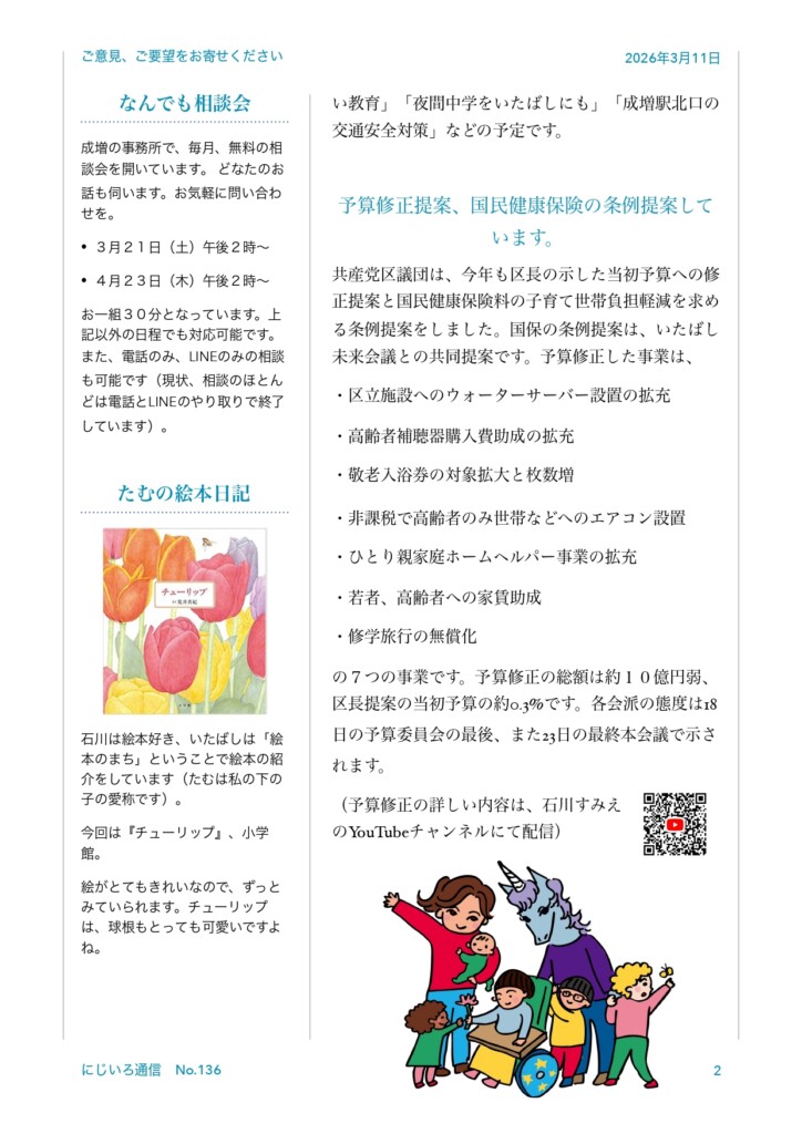質問するのは、「財政調整基金をつかって区民生活への支援を」「2026年4月の待機児童対策」「ひとり親家庭へのサポート」「誰も(親も!)取り残さない教育」「夜間中学をいたばしにも」「成増駅北口の交通安全対策」などの予定です。