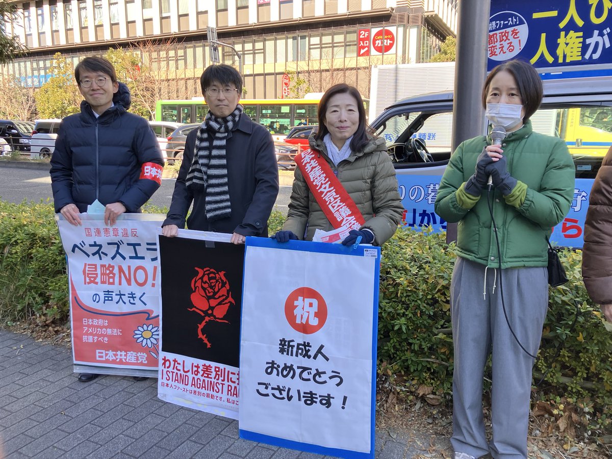 日本共産党区議団で福手ゆう子都議とともに20歳の集いに参加された新成人の皆さんに向けて街頭宣伝を実施!