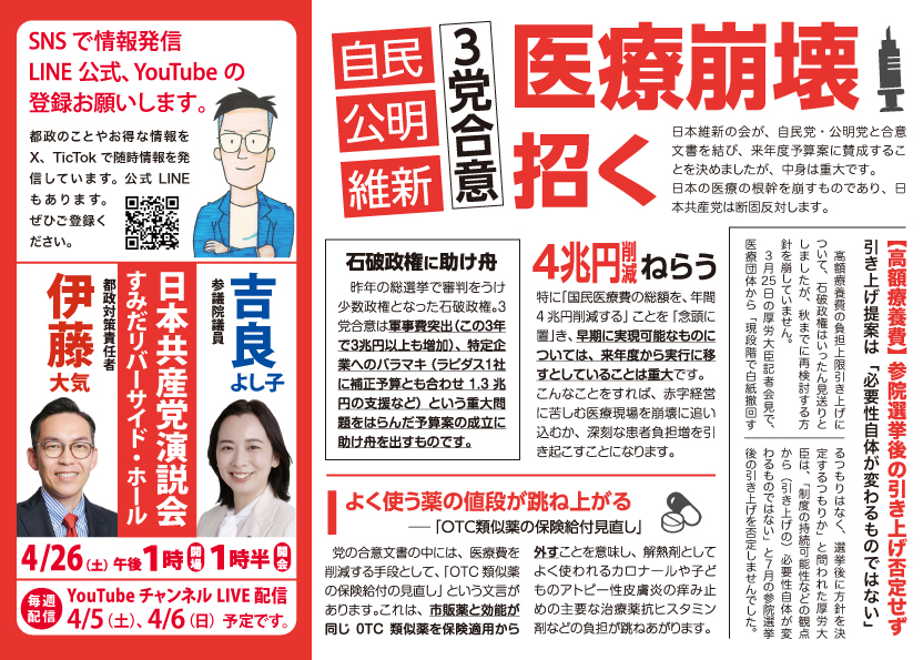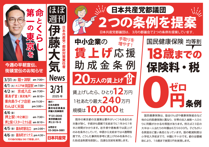 共産党都議団、賃上げ応援助成条例、18歳までの健康保険料ゼロ条例提案