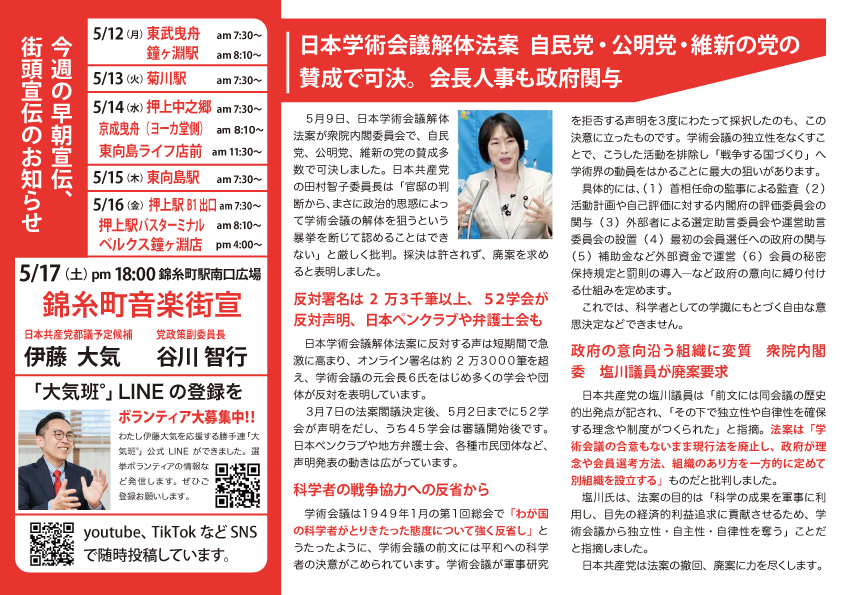 5月23日、錦糸町駅北口広場で小池晃書記局長、吉良よし子参院議員を迎えて街頭演説をおこないました。 FacebookFacebookXXLINELine
