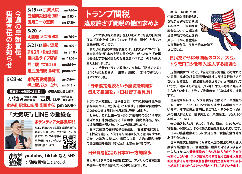 5月23日、錦糸町駅北口広場で小池晃書記局長、吉良よし子参院議員を迎えて街頭演説をおこないました。 FacebookFacebookXXLINELine