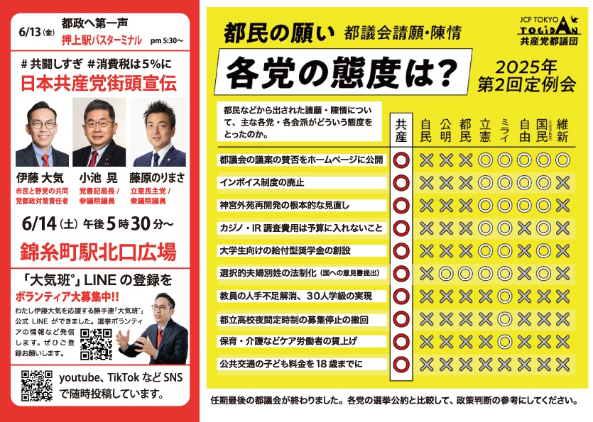 6月14日(土)午後5時半~ 錦糸町駅北口に小池晃書記局長・参議院議員が来て訴えます。私もいっしょに訴えます。 FacebookFacebookXXLINELine