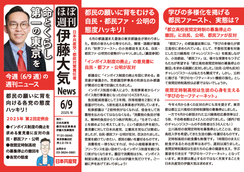 6月13日にスタートした都議会議員選挙戦は、あっという間に投票日をむかえました。 私、伊藤大気は、墨田選挙区でただ一人の野党候補として、立憲民主党や新社会党からも応援をいただいて選挙戦をたたかい抜いてきました。とりわけ立 ...