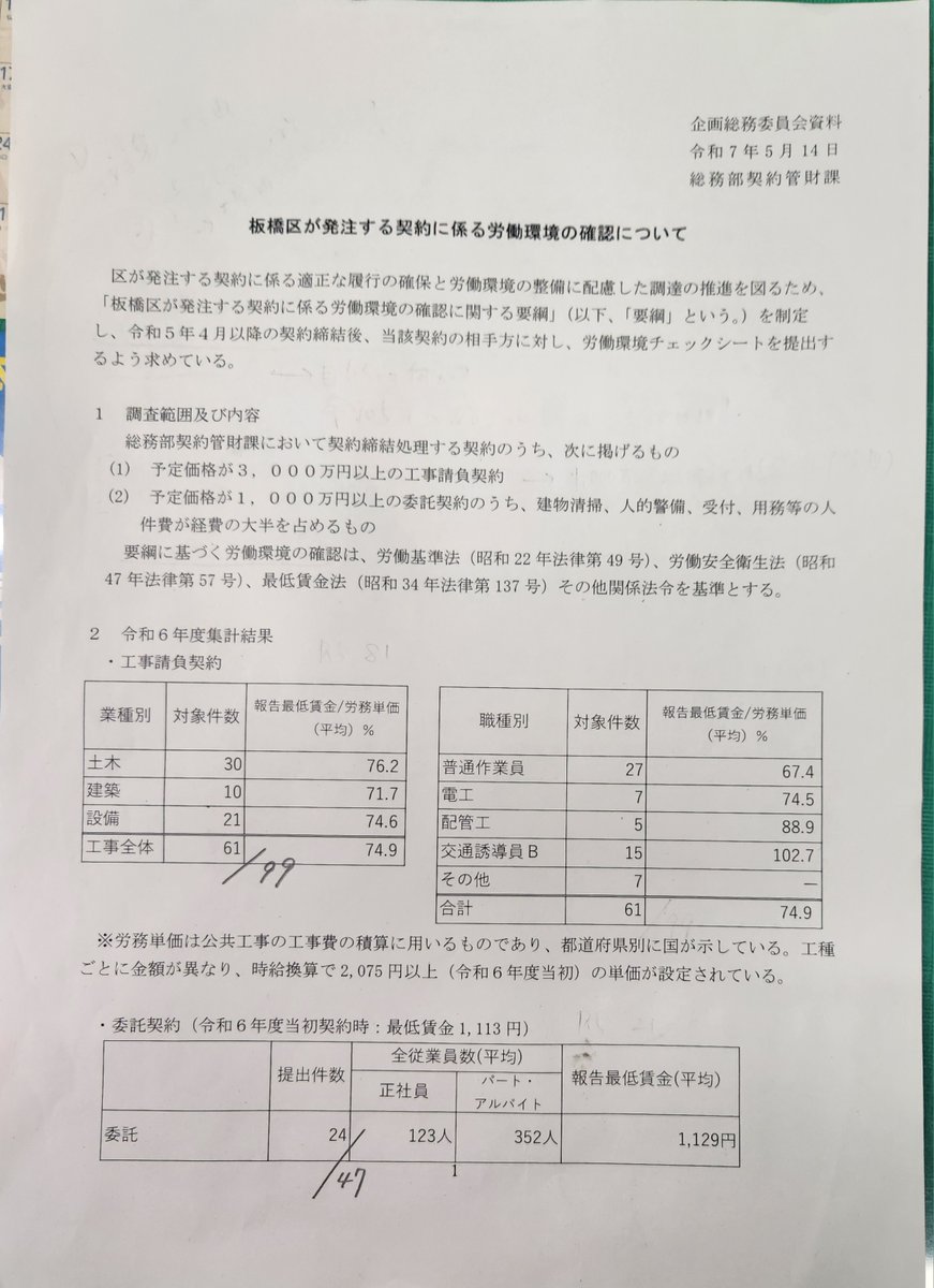 1年間の企画総務委員会最終日は、「板橋区が発注する契約に係る労働環境の確認について」が報告。