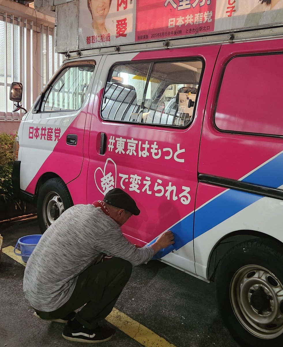 昨夜はみんなで、竹内愛都議予定候補の宣伝カーを手づくりでリニューアル第1弾。
