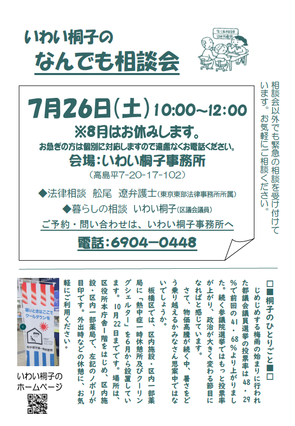 10月の生活なんでも相談会は、10月12日(日)の午後2時~4時です。お待ちいただかないためにも、事前にご予約ください。いわい桐子事務所 電話 03-6904-0448ご相談は、公式LINEでもできます。ぜひご登録を!