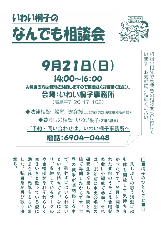 10月の生活なんでも相談会は、10月12日(日)の午後2時~4時です。お待ちいただかないためにも、事前にご予約ください。いわい桐子事務所 電話 03-6904-0448ご相談は、公式LINEでもできます。ぜひご登録を!