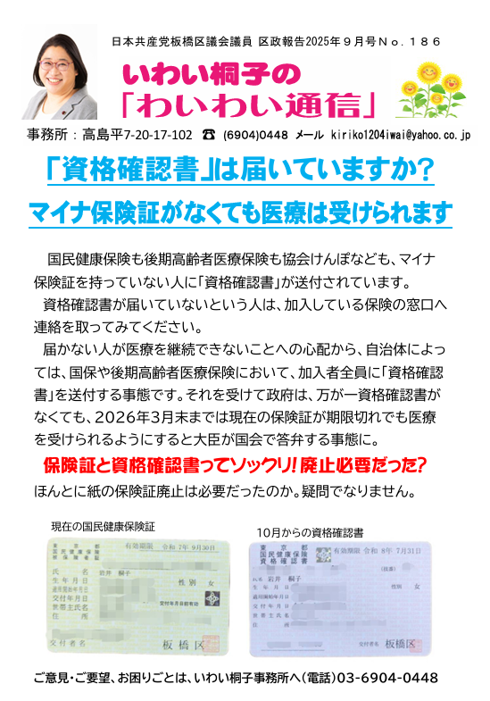 毎月恒例の生活相談会は、12月20日(土)14:00~16:00、1月18日(日)10:00~12:00に行います。事前予約性です。いわい桐子事務所(電話03-6904-0448)にお問い合わせください。