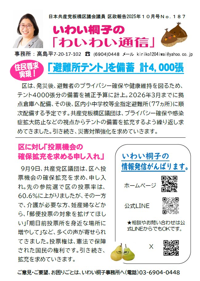 今日の本会議で区長と教育長に対し一般質問を行いました。 「非核三原則を堅持せよと国に求めよ」と質問。区長は「国の動きを注視する」というけど、注視してる場合じゃない。 #いわい桐子 #日本共産党板橋区議団