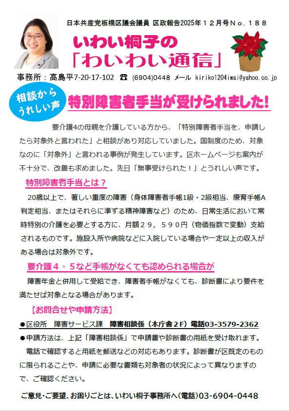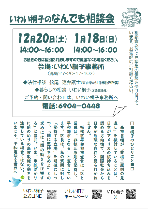 毎月恒例の生活相談会は、12月20日(土)14:00~16:00、1月18日(日)10:00~12:00に行います。事前予約性です。いわい桐子事務所(電話03-6904-0448)にお問い合わせください。