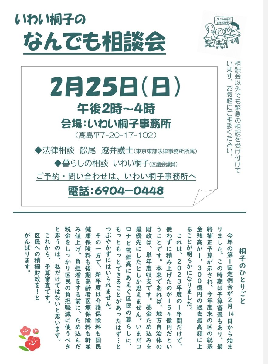 毎月恒例の生活相談会は、12月20日(土)14:00~16:00、1月18日(日)10:00~12:00に行います。事前予約性です。いわい桐子事務所(電話03-6904-0448)にお問い合わせください。