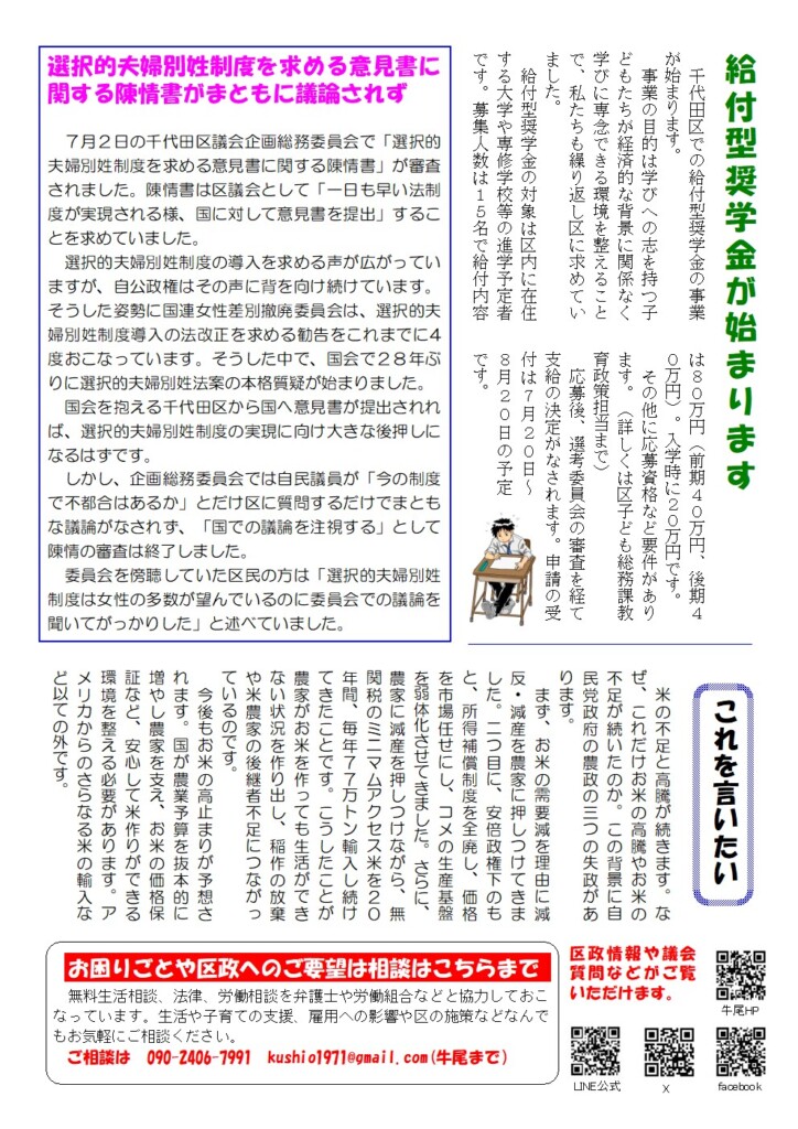 千代田区議会第3回定例会の本会議質問(一般質問)での私がおこなった質問と答弁は以下です。 牛尾議員/日本共産党の牛尾こうじろうです。一般質問を行います。最初に、千代田区が、7月18日に一般社団法人不動産協会に対して行った ...