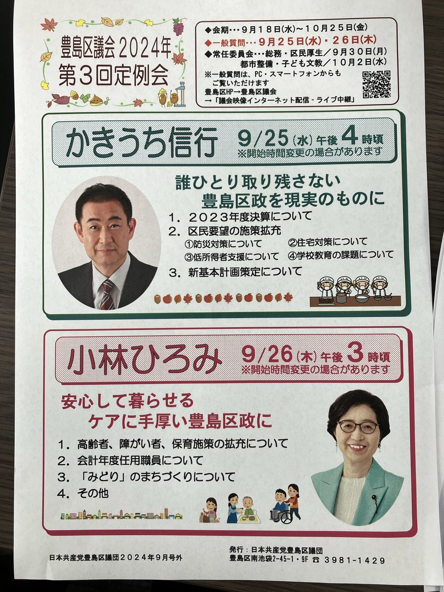 今朝のおはよう宣伝は椎名町駅南口です。支部のみなさんと総勢4名で、#しんぶん赤旗 の宣伝チラシと私の議会報告チラシ配布しました。 今年最後の区議会が始まりました。 明日の一般質問に立ちます。午後4頃からです。是非傍聴お願 ...