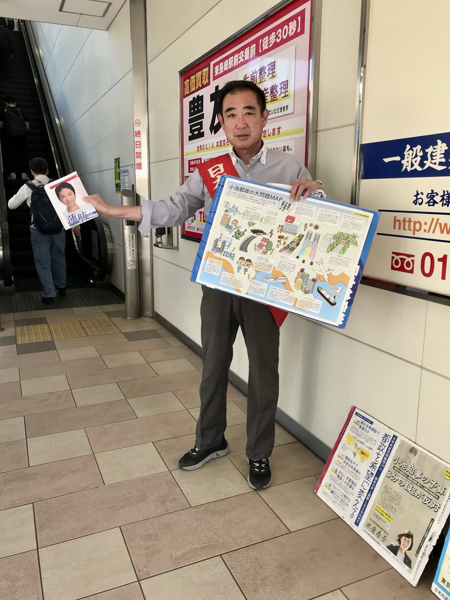 今朝のおはよう宣伝は、東長崎駅南口です。出来立ての #都知事選挙 出馬表明した #蓮舫 参議院議員の決意と都政問題を掲載した東京民報号外を配布しながら、小池都政からの転換を呼びかけました。