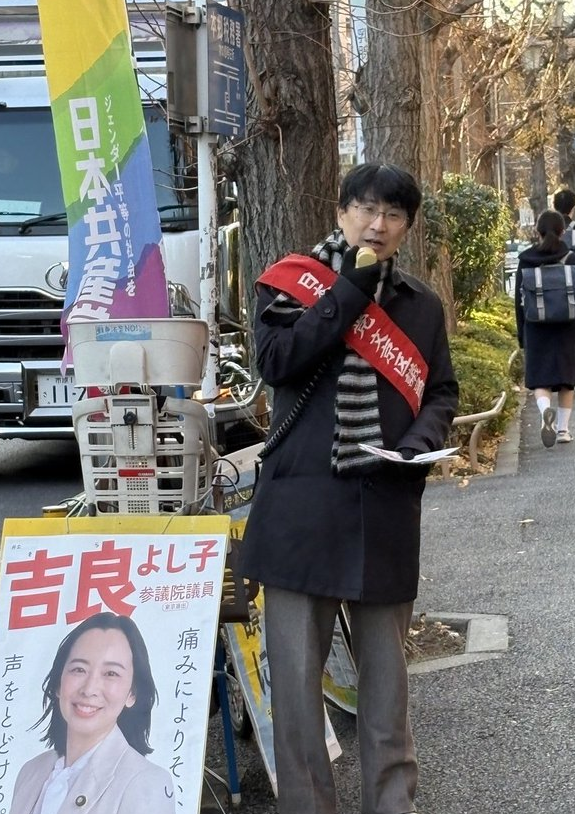 危険な暴走政治ストップ  金子区議は21日朝、根津駅頭で「議員定数削減を許せば裏金議員だけの国会になってしまう」と訴え「断固阻止する広範な共同を」と呼びかけ「自民・維新の連立、悪政推進の〝反動ブロック〟に正面から対決する ...