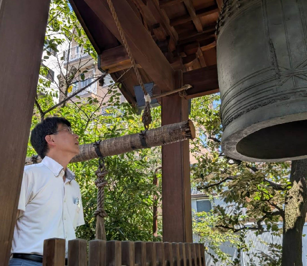 小石川の源覚寺の梵鐘は1690年に作られ、第2次大戦中にサイパン島に新設されたお寺に贈られました。戦後、アメリカテキサス州に鐘があるわかり、その後、カルフォルニアのオ―クランドに移っていましたが、源覚寺の熱心な交渉で遂にお寺に戻すことができたとのこと。サイパン島での戦闘の傷跡、弾痕もあり、鐘の数奇な運命をご住職から伺い、反戦平和の思いを込め、終戦記念日に鐘をつかせて頂きました。