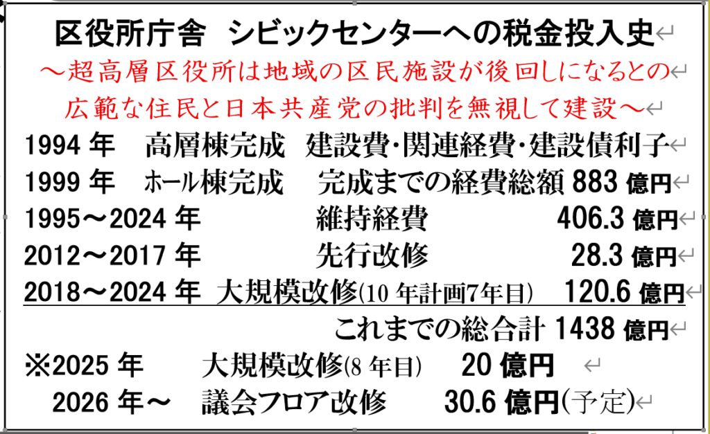金子区議は更に、不忍通りふれあい館は築28年なのに大規模改修の計画すら無いと指摘し、その一方でシビックセンターには建設以来の31年で、維持費含め1438億円の税金が投じられ、今年度は20億円、来年度からは議会フロアに30億円を注ぎ込む構えであり、シビック最優先の区政運営は認められないと指摘し、区民施設の改修・更新を急ぐよう要求しました。