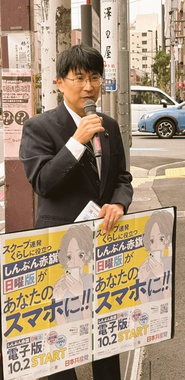 危険な暴走政治ストップ  金子区議は21日朝、根津駅頭で「議員定数削減を許せば裏金議員だけの国会になってしまう」と訴え「断固阻止する広範な共同を」と呼びかけ「自民・維新の連立、悪政推進の〝反動ブロック〟に正面から対決する ...