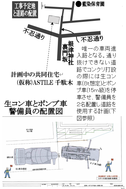 唯一の車両進入路となる不忍通りからの狭い道路は、工事開始時間と説明する8時頃に小学生や藍染保育園への登校・園が集中します。