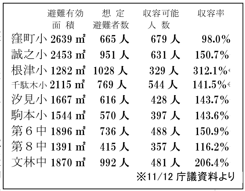 災害時に開設される33箇所の避難所の中で、1人当たりの面積を国際基準(スフィア基準)の3.5㎡で再計算したところ、想定される避難者全員を収容できるのは窪町小のみで、根津小で収容できない人数が最大となる計算結果を12日、区が公表しました(下図参照)。