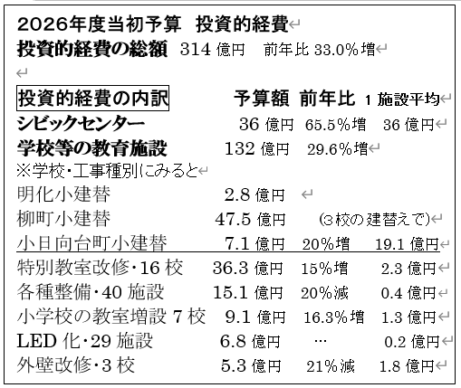 総額1604億円の新年度予算案の中で施設工事に掛かる投資的経費は前年度から33%増の314億円ですが、増加率はシビックセンターが前年比65%増である一方、学校等の教育施設は29%増に留まることが5日、金子区議の予算総括質問で明らかになりました。