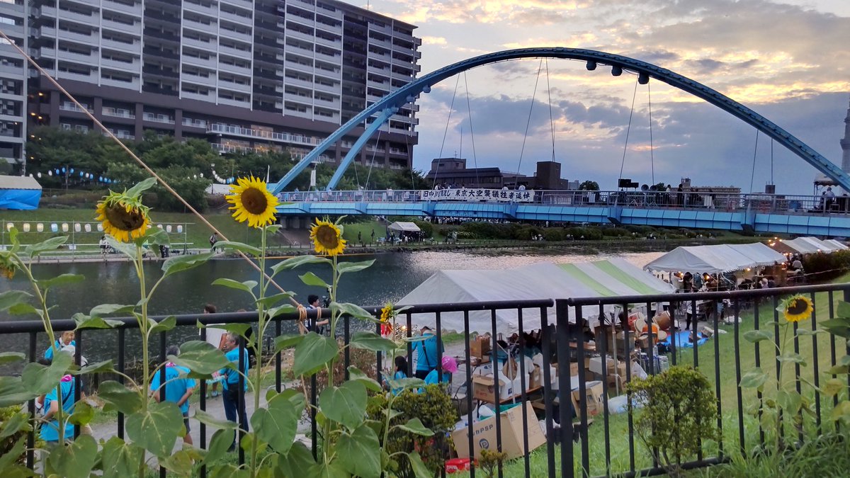 江戸川区と江東区を渡す、ふれあい橋にて灯籠流しの式典がまもなく始まります。