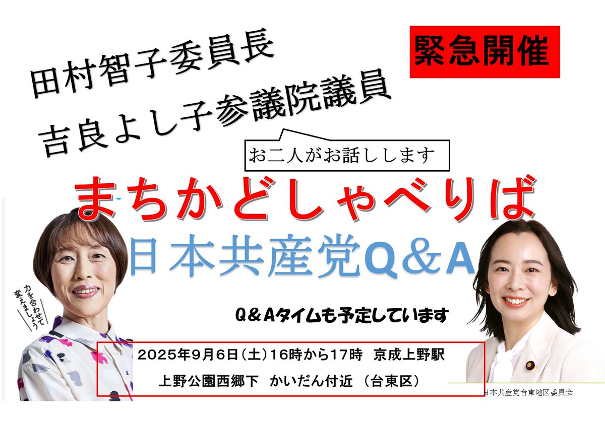 田村委員長と吉良さんが話します。まちかどしゃべりば