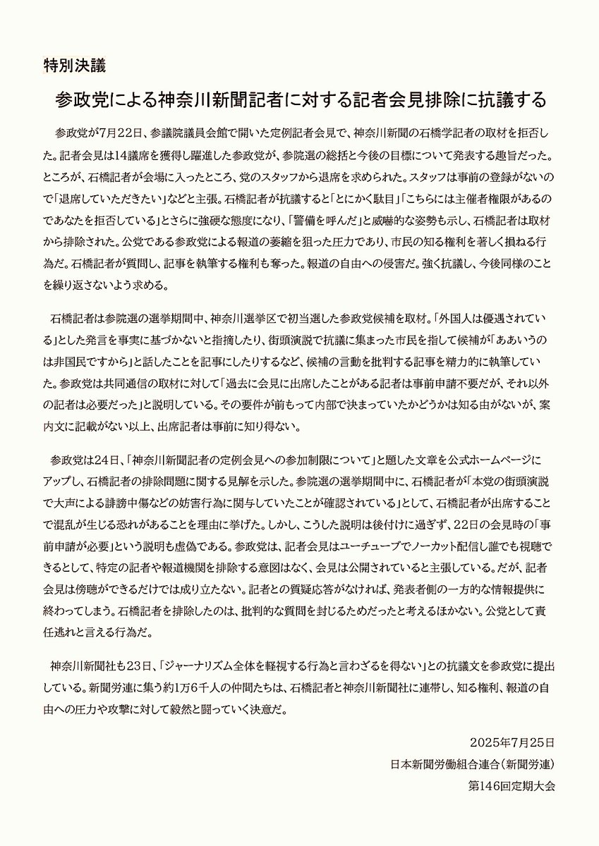 「石橋記者と神奈川新聞社に連帯し、知る権利、報道の自由 への圧力や攻撃に対して 毅然と闘っていく決意だ」