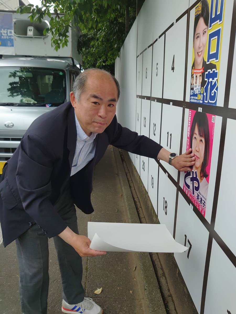 公営掲示板のポスター貼り、11時までにはほぼ完了しました。お疲れ様でした。