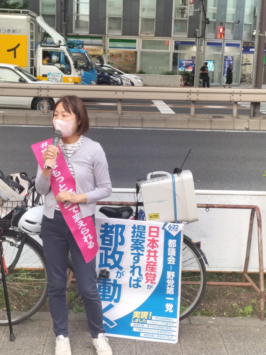 昨日28日、板橋本町駅のA1、A4出口、交差点の対角線で、日本共産党 竹内愛 都議予定候補が都政について話しました。