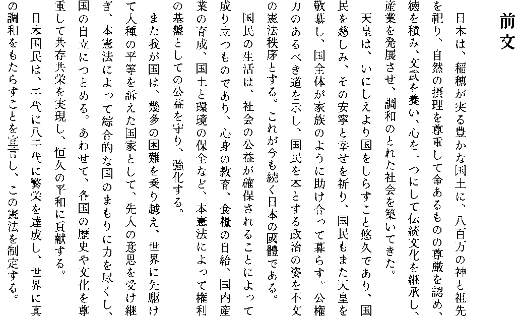 参政党のみなさんは、大日本帝国憲法が大好きらしいですね。また、参政党の憲法草案を批判する方の中に、これを大日本帝国憲法になぞらえる方がいますが、私は反対です。日本国憲法に比べると、いちいち挙げませんが問題だらけ、あの戦争への道をひらいたのも大日本帝国憲法ですので評価はしたくないのですが、参政党の憲法草案と並べるのは、伊藤博文、井上毅、伊東巳代治(この人たちも問題ありますが)に失礼ではないかと思います。不平等条約を解消するため、先進諸国と肩を並べる文明国であることを示すため、大日本帝国憲法は制定されました(その意味では、「押しつけ憲法」に他なりません)。そして、不十分ではありますが、立憲主義に基づくものでした。前文だけを読んでも明らかですが、この草案は憲法の名に値しない落書きに過ぎません。