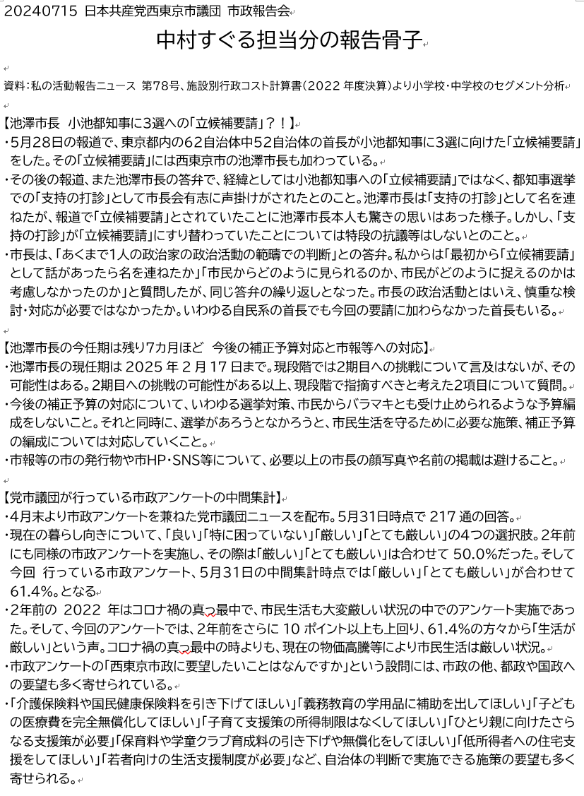 私からは、市長の政治姿勢、党市議団が実施中の市政アンケートの中間集計、今後の公共施設の再編等についてを報告しました。