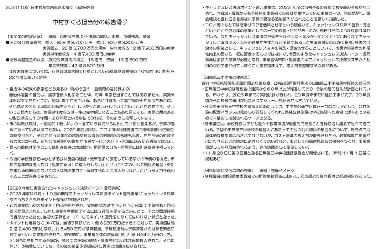 11月2日に西東京市議会 第3回定例会(9月議会)を経ての #日本共産党 西東京市議団の市政報告会を開催しました。総選挙直後の迫った日程での告知となり、当日は雨天だったにも関わらず40名を超える方々にご参加いただきました。