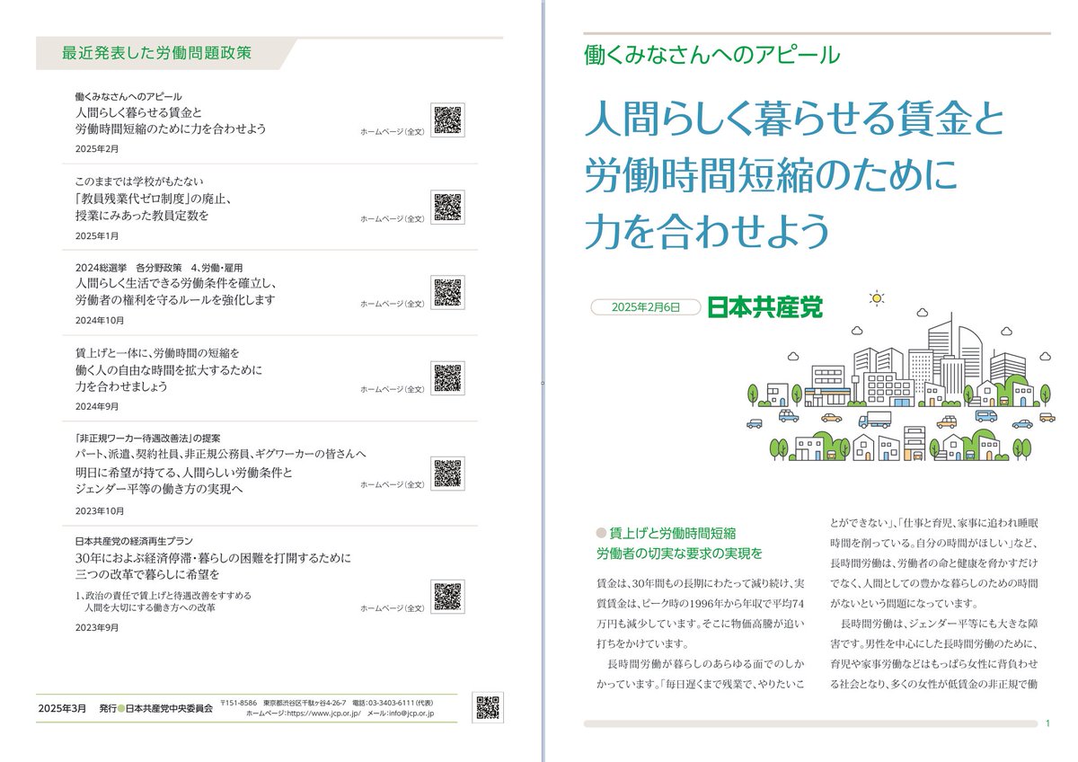 2月6日に #日本共産党 が発表した 働くみなさんへのアピール「人間らしく暮らせる賃金と労働時間短縮のために力を合わせよう」がパンフレットになりました。