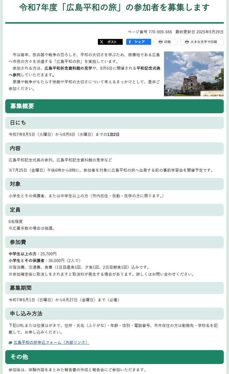 #西東京市 市報 6月1日号の11面に、「広島 平和の旅」への参加者募集の記事が掲載されました。